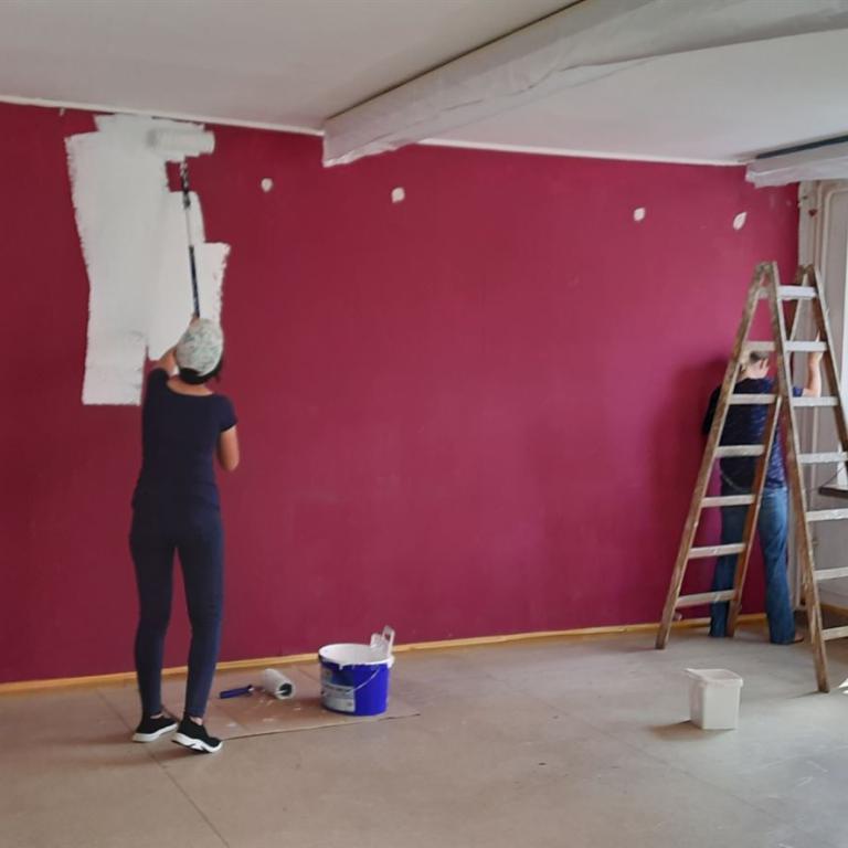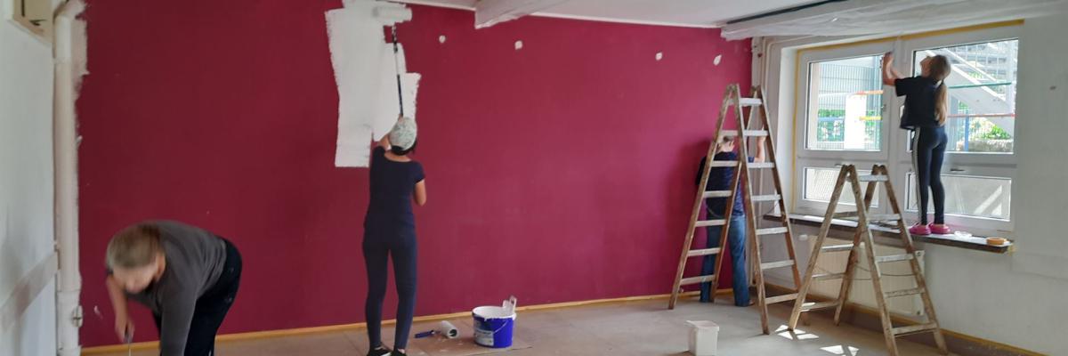 Beide Räume wurden in den vergangenen Wochen von Lehrern, Bauhof und unserem Hausmeister geräumt und am 08.07.2022 gemeinsam mit einigen Eltern frisch gestrichen. Die Profis hatten den Plan, wiesen ein und halfen. So konnte jeder seinen Beitrag leisten und helfen. Die Farbe stellte der Schulträger zur Verfügung, die Verpflegung stellte das Lehrerteam bereit. Decken, Wände. Fußbodenleisten - alles fast wie neu.