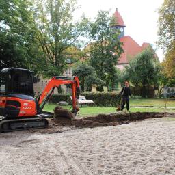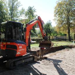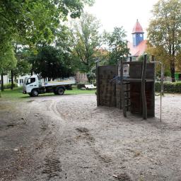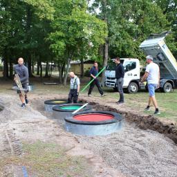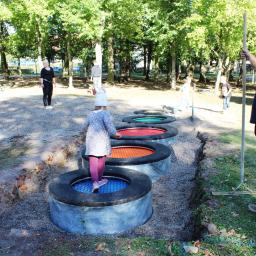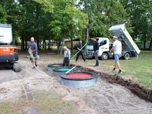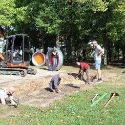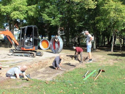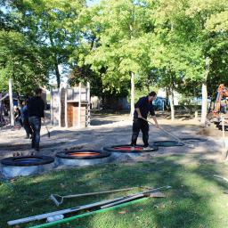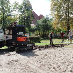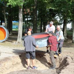 Den größten Anteil an der professionellen Umsetzung hatte Herr Lars Schirmer, der mit großem Baugerät den Bodenaushub bewerkstelligen konnte und sich beim Einbau der Trampolinteile den „Hut aufsetzte“. Er grub, maß, leitete an, wusste, wann welche Mengen Kies an welcher Stelle benötigt wurden und verteilte diesen.