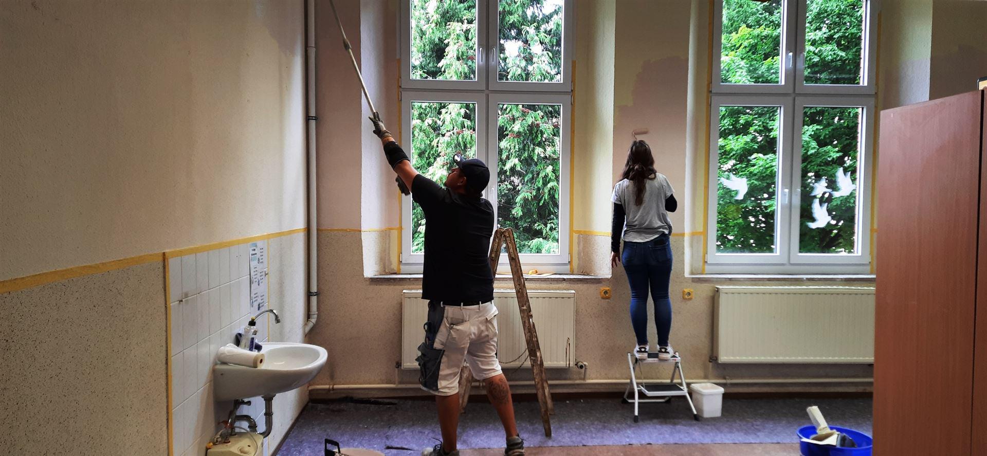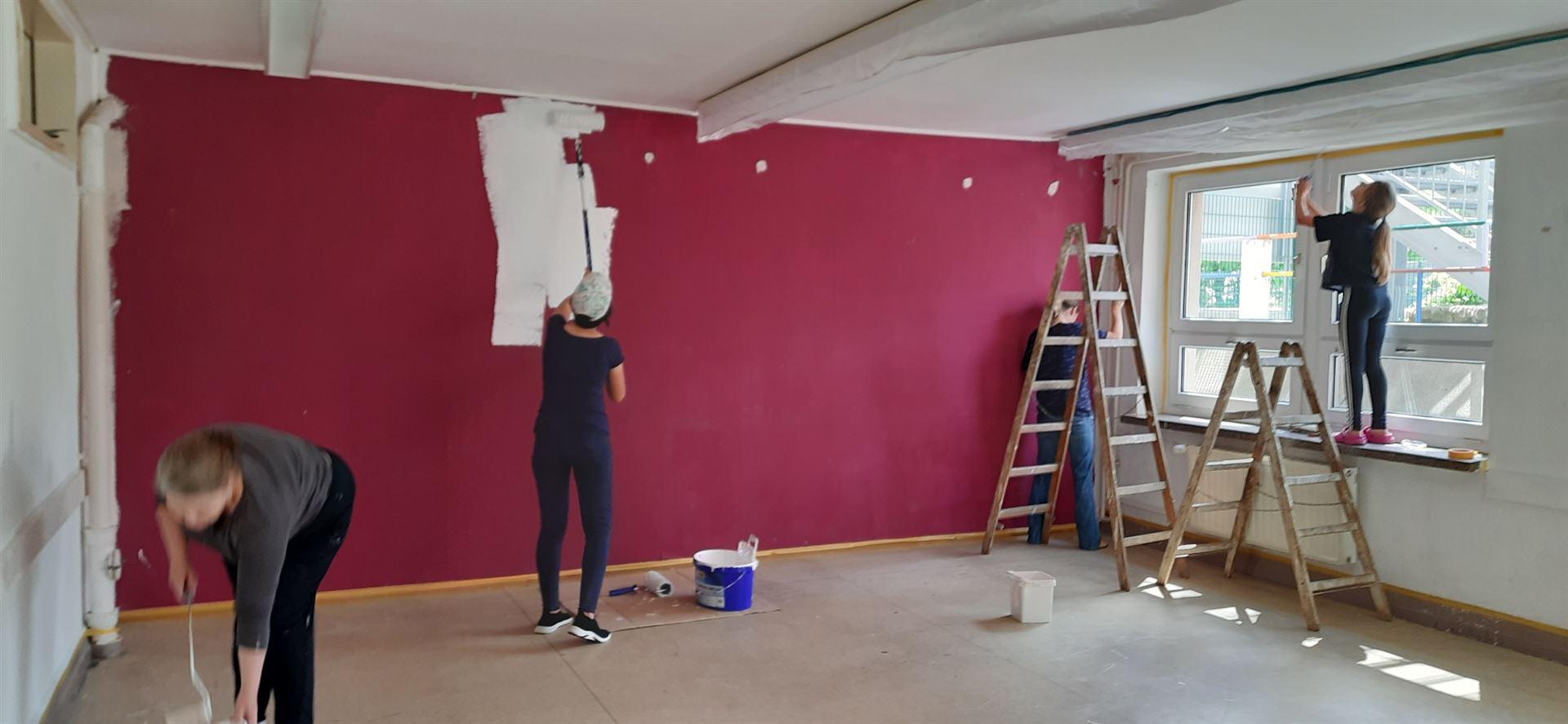 Beide Räume wurden in den vergangenen Wochen von Lehrern, Bauhof und unserem Hausmeister geräumt und am 08.07.2022 gemeinsam mit einigen Eltern frisch gestrichen. Die Profis hatten den Plan, wiesen ein und halfen. So konnte jeder seinen Beitrag leisten und helfen. Die Farbe stellte der Schulträger zur Verfügung, die Verpflegung stellte das Lehrerteam bereit. Decken, Wände. Fußbodenleisten - alles fast wie neu.